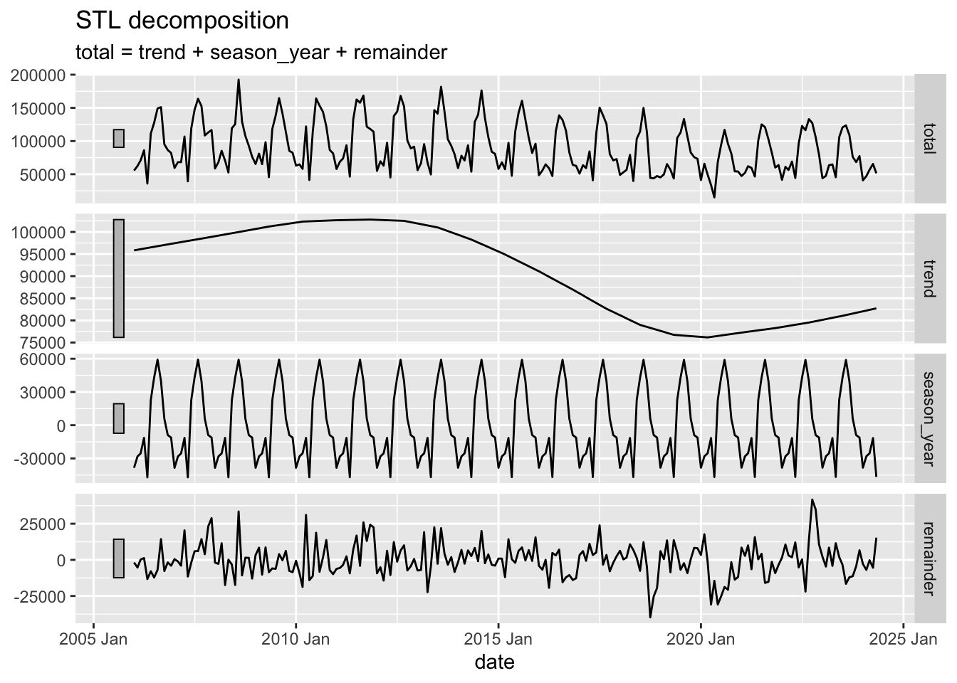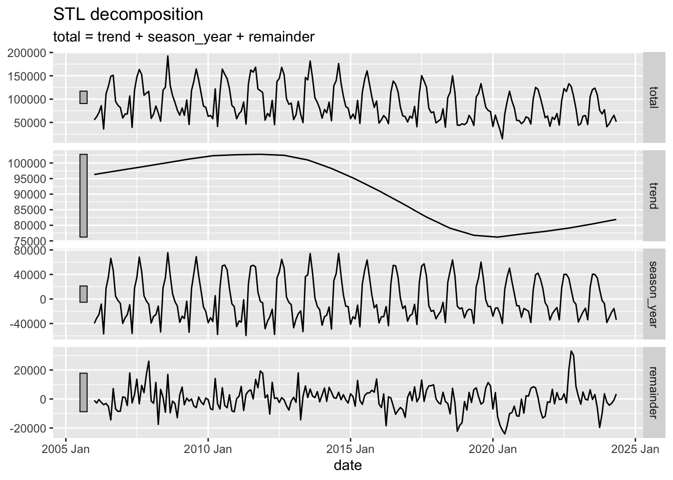 model(decomp = STL(total ~ trend(window = 100) + season(window = 5))) |>