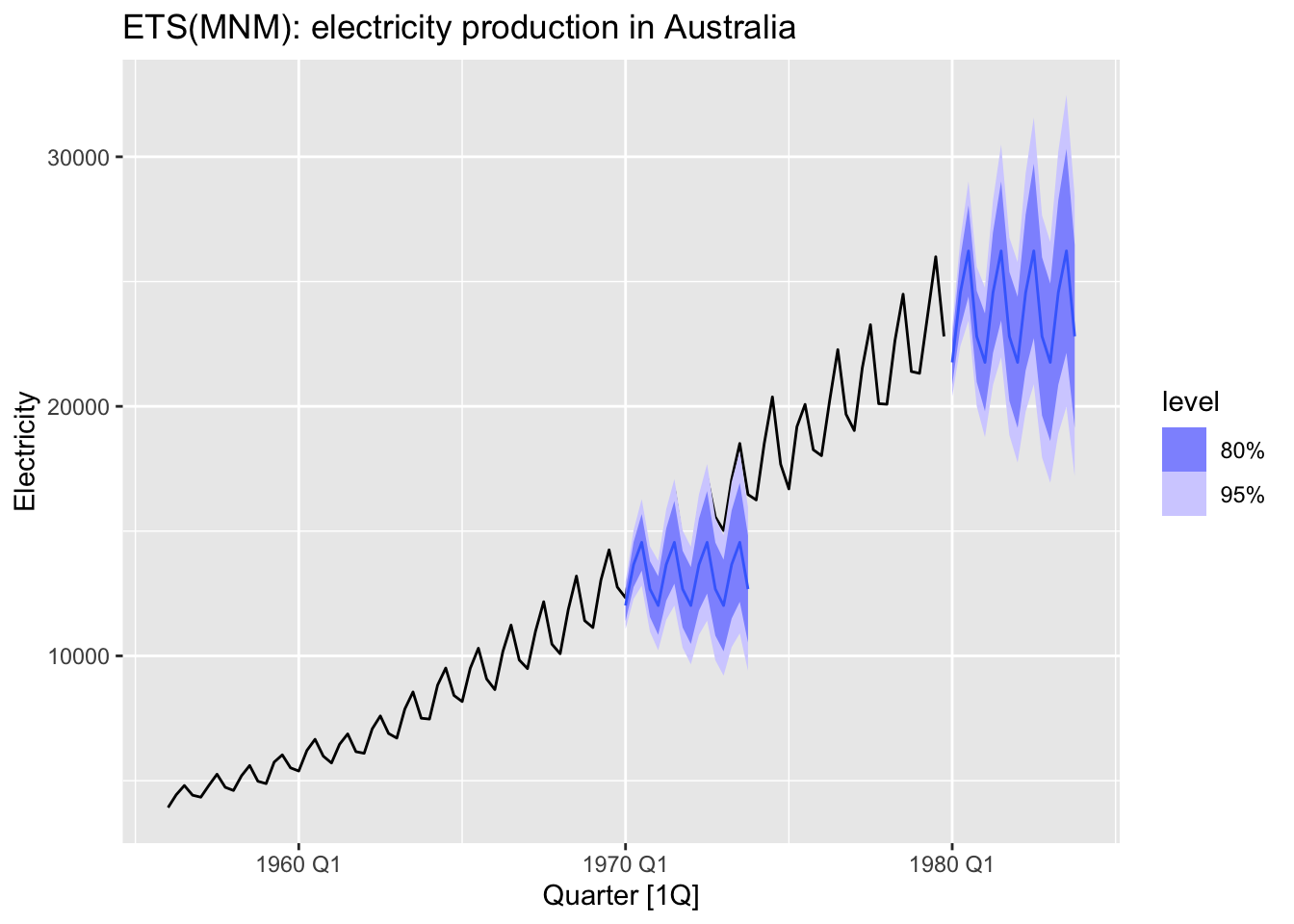 labs(title = 'ETS(MNM): electricity production in Australia')## Scale for fill_ramp is already present.